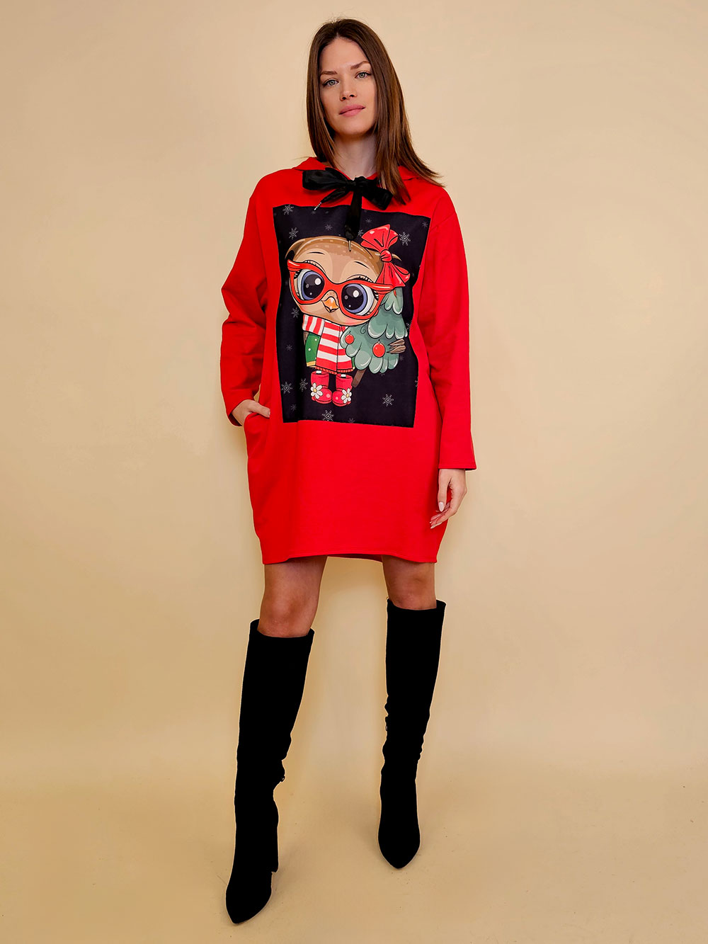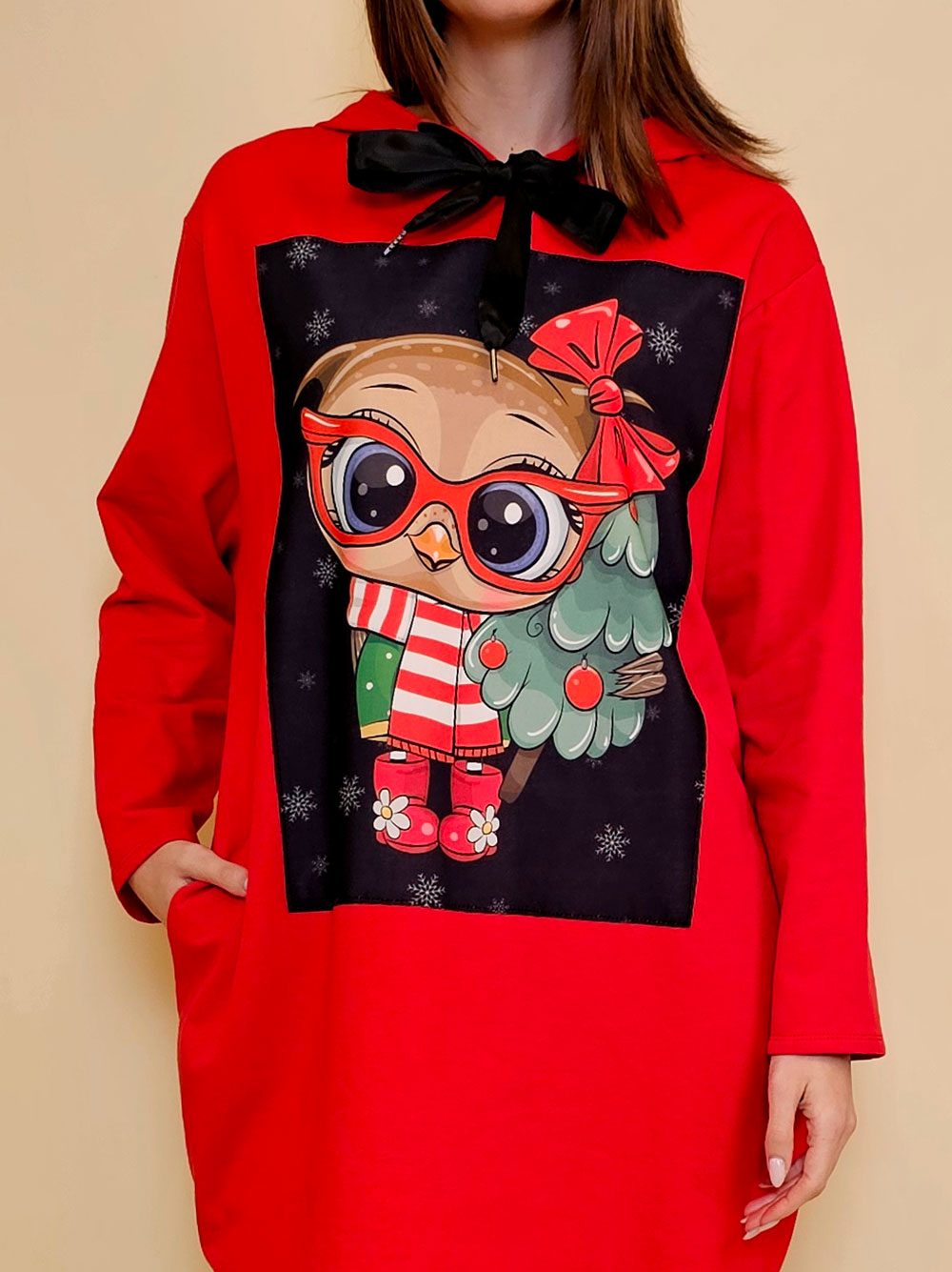 Pamučna deblja winter felpa haljina El Hood – Božić Sovica & Bor black